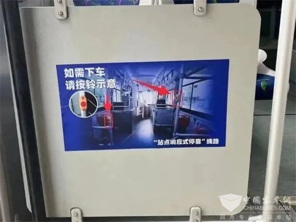 为让市民更好地了解“响应式停靠”服务,在1311M车后门附近的玻璃上、车身上都贴有“如需下车请按铃示意”的提示。此外,每次快到站时,司机都会提前进行站点播报,车上显示屏也会滚动显示下一站站名。不少乘客快到站时会自觉在后门处等待,当司机从后视镜观察到乘客有下车需求时会提醒按铃,然后在站点停靠开门。