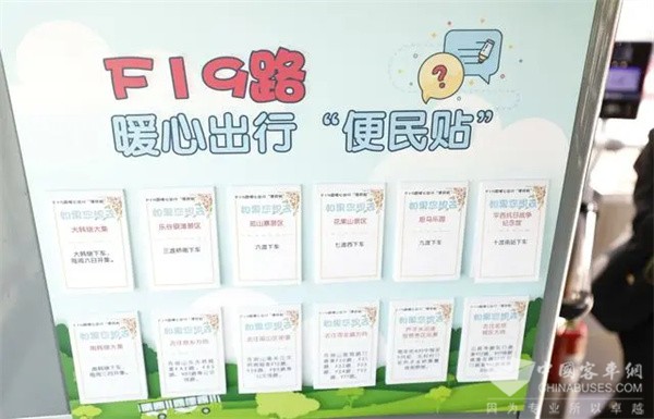 为方便乘客出行,F19路公交线路在车厢内推出了暖心“便利贴”,将乘客日常询问比较多的景点、集市和换乘路线标注在便签上,乘客可根据自己的出行需求进行取用,极大地方便了老年乘客和外地乘客顺利出行。