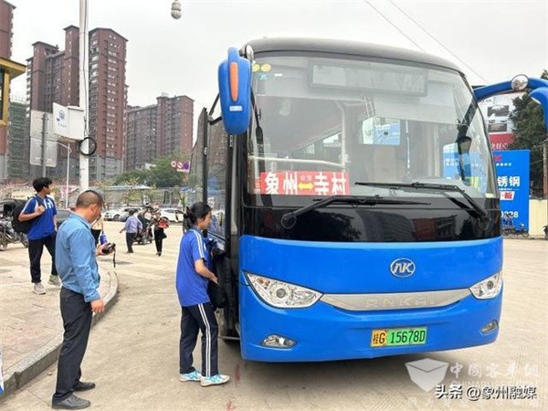 2023年4月14日,记者在象州县民族中学看到蓝色的公交车整齐地停靠在学校里,车厢内崭新的座椅、整洁的环境,学生们正在有序的排队等待乘车。