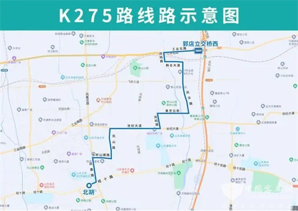 K275路由郭店立交桥西开往北胡,主要途经工业北路、凤鸣路、韩仓大道、韩仓河东路、凤华路、章灵丘街、凤鸣路、世纪大道、凤山路、长岭山南路、凤凰路、经十路,沿途设置郭店立交桥西、韩仓、韩仓大道凤鸣路、龙湖城市之光北区、韩仓河东路北口、韩仓河东路彭家北路、凤华路将山北街、凤华路世辉街、章灵丘街凤华路、章灵丘街韩仓河西路、章灵丘街凤容路、章灵丘街凤锦路、凤鸣路章灵丘街、世纪大道凤鸣路(路北)、凤鸣路世纪大道(路东)、安家、世纪大道凤歧路、凤山路世纪大道(路西)、世纪大道凤山路(路南)、恒大奥东新都、凤山路长岭山路、长岭山南路凤山西路、凤凰路舜风路(路西)、长岭山南路凤凰路(路南)、刘智远村、公交驾校、北胡站点。