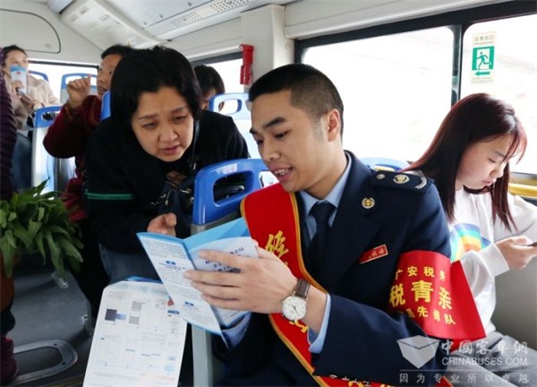 “税务蓝”公交专线上,“经税达”定制服务队、“青年文明号”青年干部化身税收宣讲员,为乘客提供税收宣传辅导,发放“网上办税·码上知道”服务联络卡、最新优惠政策宣传单页,向乘客介绍各项税收优惠政策的知识点,普及最新税法知识,针对群众关心的涉税热点、难点问题进行耐心讲解,积极回应群众关切,为广大市民创造“一路税行、暖心相伴”的税收普法平台,营造宣税、学税、懂税的浓厚氛围,让“便民办税春风”随公交车走街串巷,吹进千家万户。