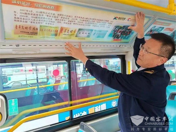 据介绍,304路线于2019年被授予全国“青年文明号”荣誉称号。在四川路场站内,驾驶员王勇正忙着对304路“青年文明号”进行装饰。车厢中“无奋斗,不青春!”的宣传标语十分醒目,宣传海报、青年文明号简介也清楚明了,如同一个流动的文化主题馆。