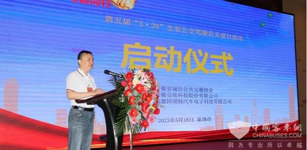 安徽省交通运输厅党组成员、总工程师晏少鹤代表省交通运输厅向默默奉献在全省公交一线的驾驶员师傅们致以崇高的敬意和节日的问候,指出公交驾驶员为全省城市公交发展步入快车道作出了巨大贡献。同时指出公交驾驶员劳动强度大、安全责任重、身心压力大,生活工作环境有待进一步改善,需要全社会理解、关心和支持,呼吁社会各界积极参与支持公交事业发展,共同关心关爱、理解尊重公交驾驶员群体。他要求,省公交协会要进一步发挥桥梁和纽带作用,凝聚公交优先发展共识,落实公交优先发展战略,树牢“以人民为中心”发展思想,为加快推进城市公交高质量发展作出新的积极贡献;全省公交企业坚持多管齐下,多措并举,始终把关心关爱公交驾驶员作为提升服务质量、推动企业发展的重要内容。晏总鼓励全体公交驾驶员要继续发扬疫情期间坚守岗位、服务乘客的责任担当,遵守交通安全法规,时刻紧绷安全之弦,文明驾驶,礼让行车,保障城市交通运转畅通,努力为市民乘客提供更加安全优质的服务,以实际行动赢得全社会的尊重,以安全优质服务为交通强国建设贡献力量。