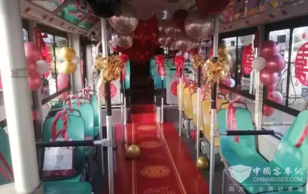 车头电子屏上“520专线”的字样、车窗上大红的“喜”字贴纸、车厢内鲜花气球等装饰、车身或是喜庆红或是浪漫粉的设计……“520专线公交婚车”车如其名,充满浓浓的婚礼氛围感。不仅如此,“520专线公交婚车”运营团队还可以结合用户需求进行设计,满足个性化需求,为新人打造一辆独特的“婚车”。