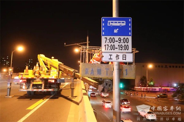 被施工人员拿在手上的标识显得很大,白底黑字,外围有一圈黑框,“工作日”三个字很醒目。做好防护措施之后,工程车开到桥上主路的西向东方向,工人将这个标识牌安装在原有公交车道标识的下方。