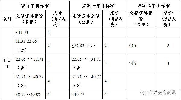 方案一,恢复日班车线路起步价格为2元;对于全程5元票价线路,取消全程营运里程49.83公里的上限限制。