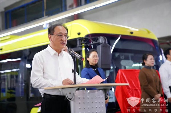 周旭栋向常州公交礼河链合智造基地首辆新能源客车下线表示热烈的祝贺。他指出,常州市当下正牢牢把握高质量发展这个首要任务,深入实施“532”发展战略,全力打造引领长三角、辐射全国、全球有影响力的“新能源之都”。我市在近三年大力推广新能源公交车,预计到年底比例达90%,纯电动公交车比例超过70%。下阶段在2025年实现纯电动公交车全覆盖目标,2024年、2025年要分别更新350辆纯电动公交车。礼河链合智造基地要把握机遇再接再厉,聚焦今年装配的75辆纯电动公交车基础上着眼长远谋发展,打造优质服务的好口碑和高品质的新能源公交车。