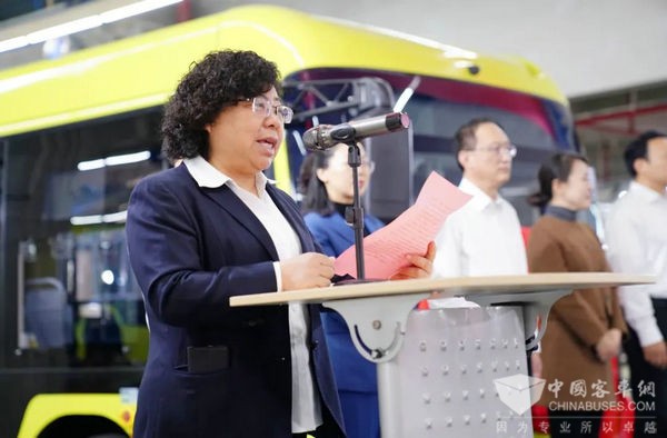 袁杏娣在致辞中感谢了常州市交通运输局、北汽福田欧辉客车等各级单位对常州公交长期的支持和关心,向参与装配制造的全体职工表示诚挚地敬意。指出常州公交下一步将以此次首辆新能源客车下线为新起点,厚积薄发,行稳致远,全力保障首批75辆新能源客车装配生产。同时要以质量满分实现用户满意,以学习不停实现创新不断,以顶格力度干出满格速度。扎实推进有序生产、安全生产、批量生产,加快产能爬坡,确保车辆早交付、早使用。