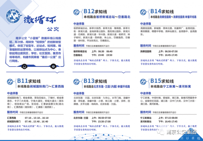 “小蓝鲸”微循环公交是南京公交2023年重点打造的民生服务品牌。微循环是“快、干、支、微”四级常规公交线网体系内的微循环公交,具有线路短、车次频、周转快“短频快”的服务特点,运行时长在三十分钟以内,主要解决受道路通行条件等因素限制,无法通过接驳支线实现线网覆盖的“背街小巷”出行问题,串联起周边居民区、学校、社区医院、集贸市场等场所,减少市民通行时间,实现“地铁到站、公交到家”。