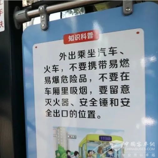 “乘119路车,做消防安全人”。在车身两侧张贴的消防安全标语简单易懂、贴近群众生活,车内原创的消防文创人物生动活泼,看板、挂牌、靠背、灰板、驾驶员挡板等部位不仅设置了醒目的消防主题元素、提示性宣传标语和消防成语故事,还设置了防火常识、正确拨打119火警电话、疏散逃生等一系列消防安全知识。坐在车上,犹如进入了一个移动的小型消防安全科普教育馆,乘客举手投足间就能便捷地获取掌握消防知识。