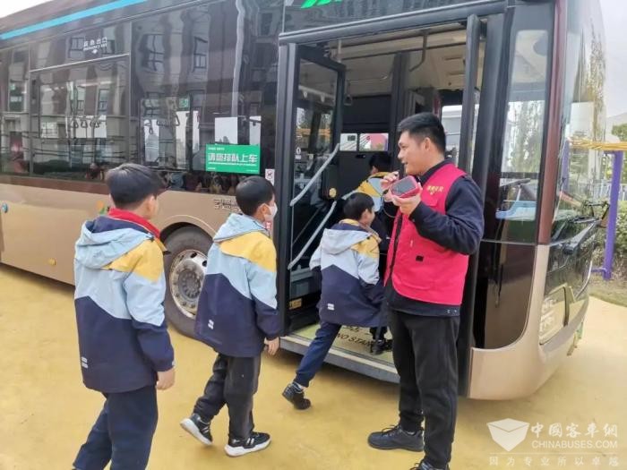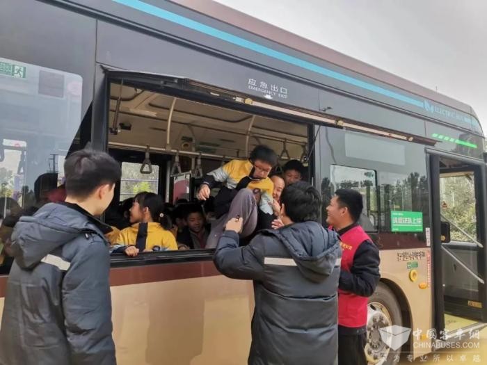随后,在郑豫炜的指引下学生们分批次进入车厢,“沉浸式”参观体验公交车。
