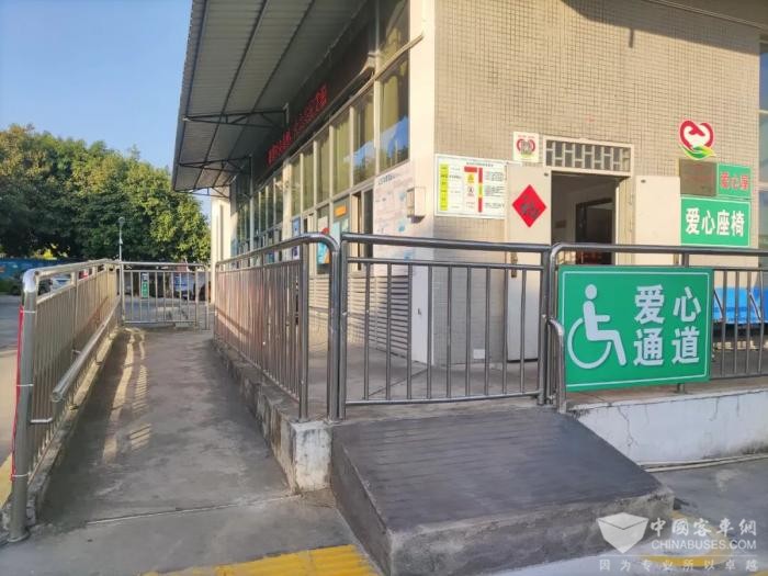 在改造候车休息区的同时,增设了无障碍通行坡道、安全护栏及扶手,沿着候车休息区无障碍通行坡道,通过场站内斑马线可连接场站内原有的无障碍通行坡道直达特殊群体上客区。