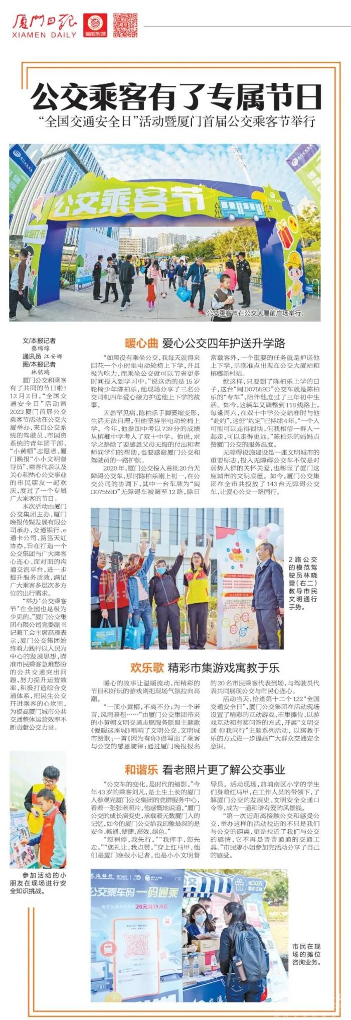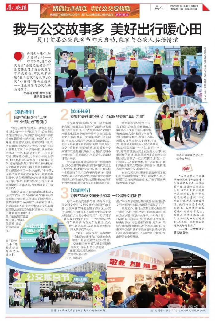 2023年12月2日下午,厦门公交集团“全国交通安全日”活动暨厦门首届公交乘客节正式启动,市民乘客讲述“我与公交”的故事。公交“小黄帽”唱响主题曲……这是乘客与公交人的共同节日。
