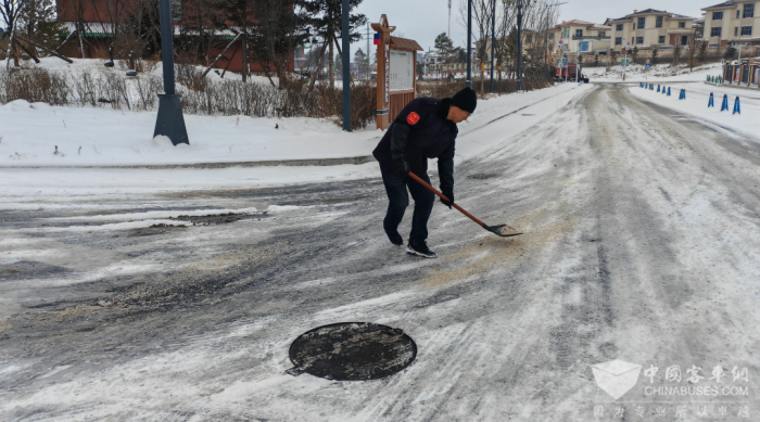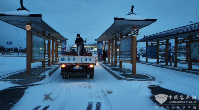 各车队值班人员如遇雪天第一时间派遣清雪车辆对公交车线路重点路段、乘车站点路面进行清扫、洒融雪剂,确保公交车辆正常运营的同时保证乘客出行安全畅通。