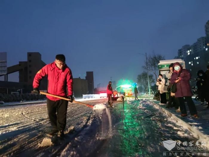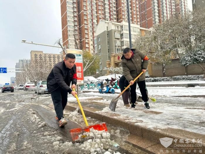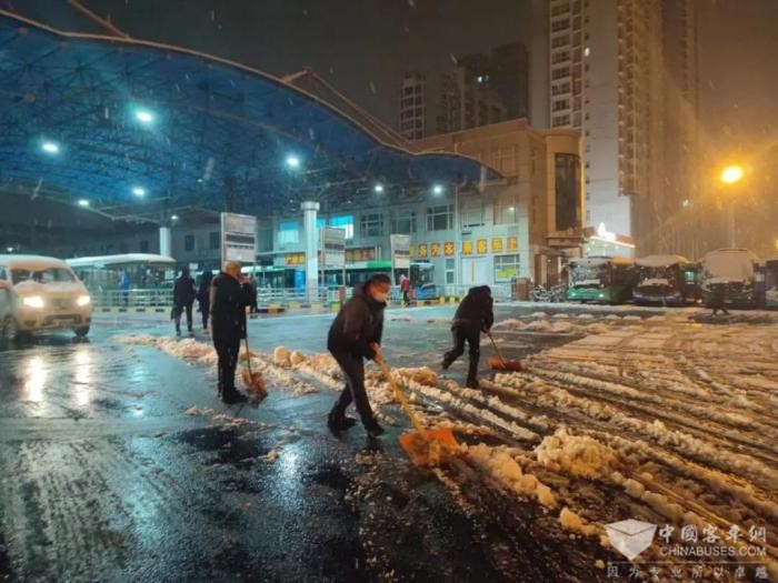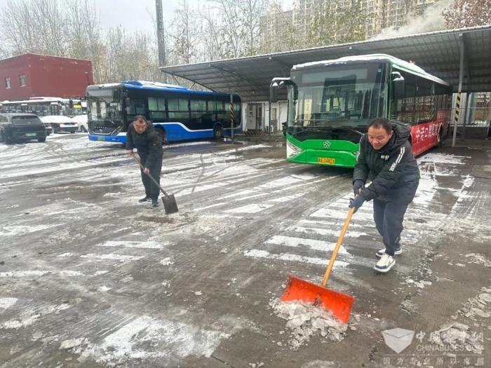 公交干部职工在场站清理积雪