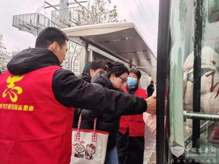 为方便市民乘车,市公交集团通过智能调度系统密切关注线路运营状况,增加趟次、缩短发车间距,实行动态管理,灵活调度车辆,全力保障市民在特殊天气下的出行需求。公交志愿者在站台引导乘客有序排队上车。
