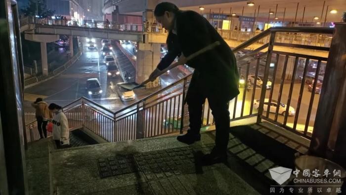 在抗凝保畅工作中,公交人不怕苦不怕累的优良传统得到充分展现,各分公司职工都积极参与到除冰工作中,一名正在站厅撒盐除冰的BRT分公司工作人员表示:“撒盐除冰工作是我们公交冬季保畅的一项重点工作,哪怕我们苦点累点,只要能让大家顺利出行,都是值得的,我们公交肩负市民朋友的出行任务,不能辜负他们的信任,我们公交人有责任也有能力为市民提供安全舒适的出行环境。”