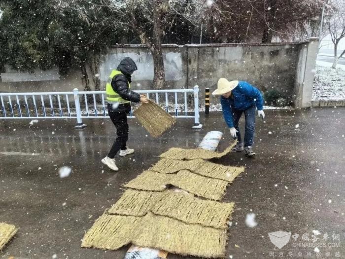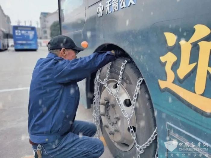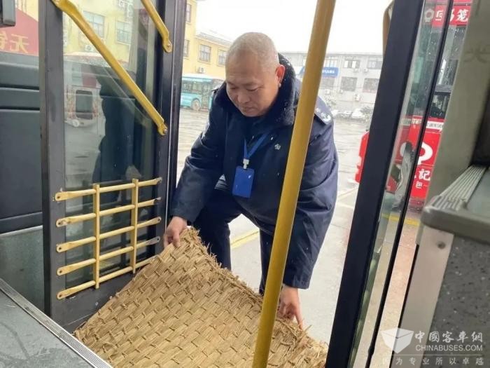 管理人员全力排查风险隐患,检查暖风设备是否正常工作,及时清理车辆、停车场、场站冰雪,严防低温恶劣天气引发安全生产事故。为保障乘客出行安全,在公交车上下车踏板处铺设草垫。并通过张贴告示,现场提醒等方式提醒驾驶员减速慢行,注意雪天行车安全,同时机务人员还安装好一批防滑链轮胎应急备用。