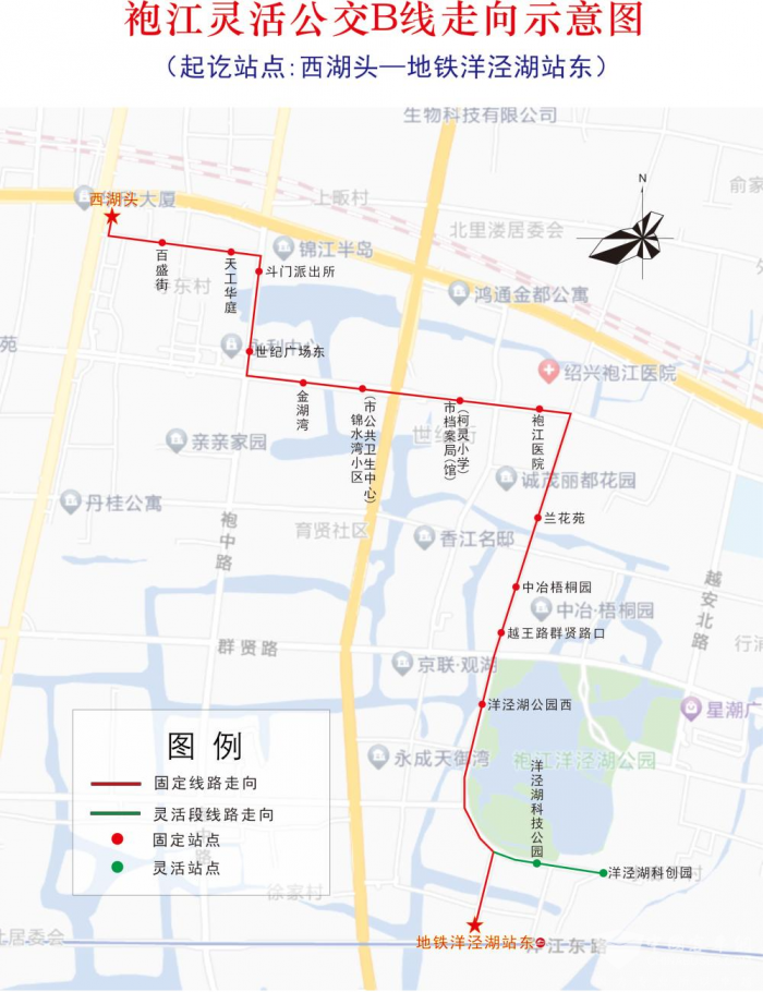 袍江灵活公交B线从西湖头始发,途经百盛街、袍中路、世纪街、越王路至地铁洋泾湖站东,沿途停靠12个固定公交站点,设有“洋泾湖科技公园、洋泾湖科创园”2个灵活站点,串联世纪广场、柯灵小学、袍江医院、袍江人才公寓、洋泾湖地铁站等出行热点;发车时间为西湖头6:30-8:15、16:45-17:45,地铁洋泾湖站东6:50-8:15、16:50-18:00,发车间隔15分钟。