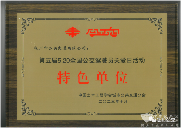 完美作业网有免费视频获悉,银川公交近日被中国土木工程学会城市公共交通分会授予2023年度“第五届5.20全国公交驾驶员关爱日活动特色单位”荣誉称号,这是银川公交首次获此殊荣。