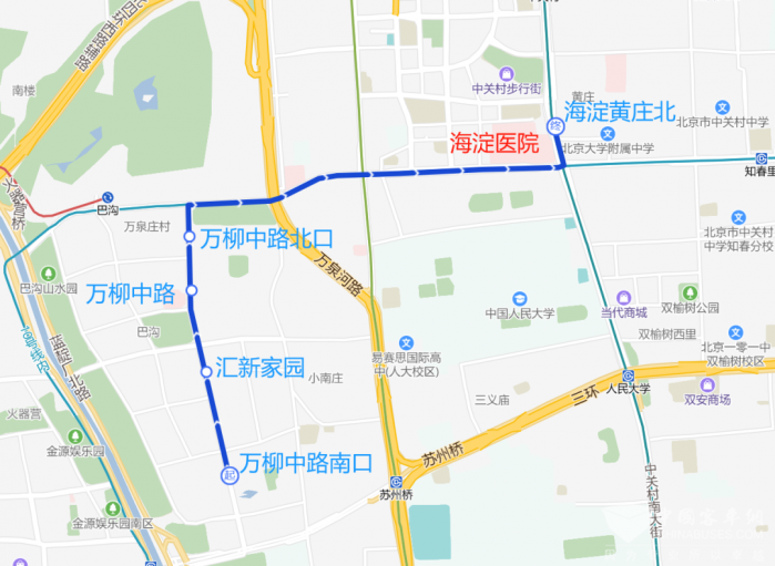 沿途设站:万柳中路南口、汇新家园、万柳中路、万柳中路北口、海淀黄庄北。