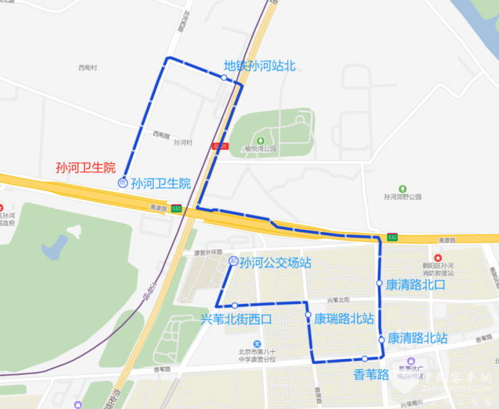 沿途设站:孙河公交场站、兴苇北街西口、康瑞路北站、香苇路、康清路北站、康清路北口、地铁孙河站北、孙河卫生院。