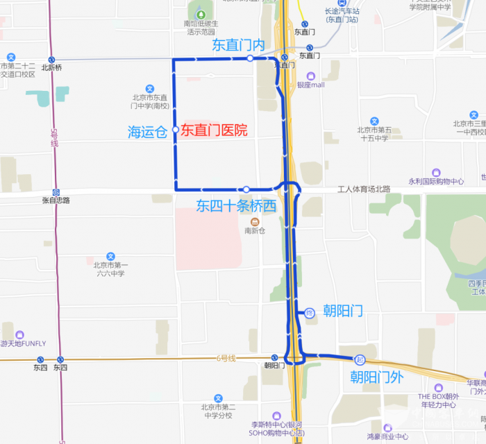 沿途设站:朝阳门外、东四十条桥西、海运仓、东直门内、朝阳门。