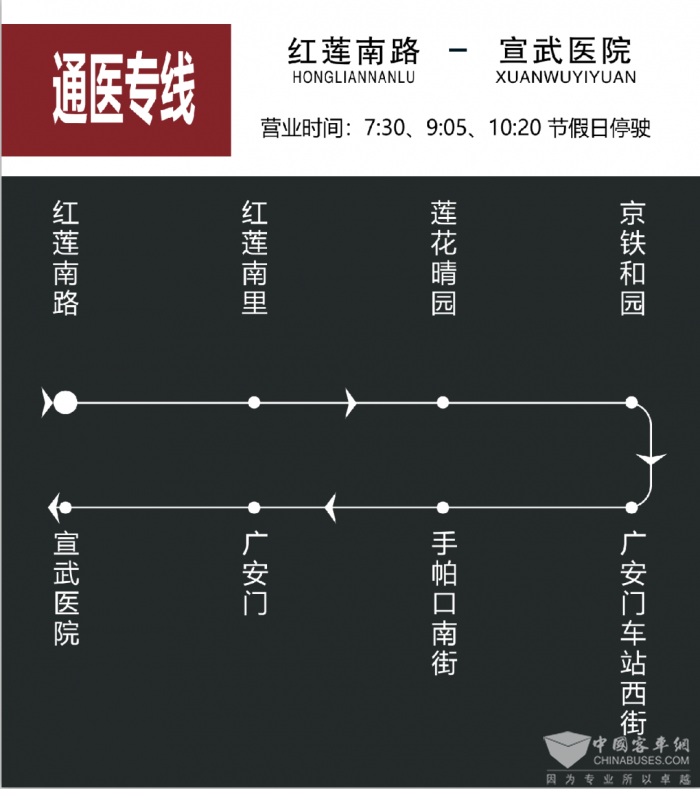 运营时间:红莲南里平日7:30、9:05、10:20,节假日停驶;宣武医院平日8:20、9:45、11:00,节假日停驶。