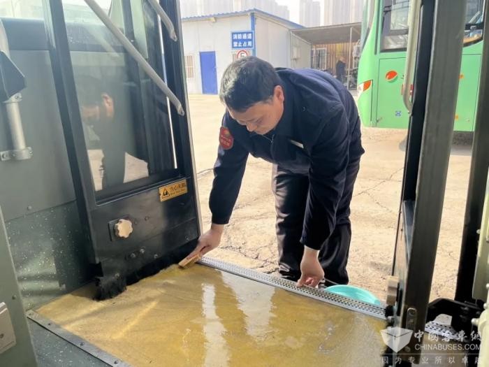 “前后门台容易藏污纳垢,大家需要多耐下心来,用抹布沾着清洁液一点一点去清理。”在百荣世贸商城公交站,136路调度员徐方带领驾驶员们对车内座椅、地面、扶手、车窗等进行打扫、擦拭,确保车辆达到“车外干净、车内整洁、标识规范”的标准,为市民出行营造一个整洁舒适的乘车环境。