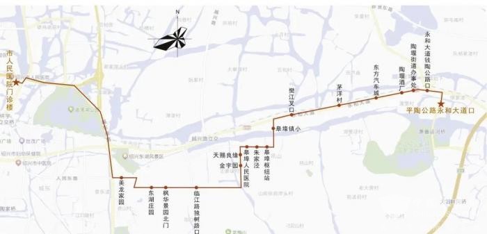 平陶公路永和大道口、永和大道钱陶公路口、陶堰街道办事处、陶堰酒厂、东方汽车城、茅洋村、樊江叉口、皋埠镇小、皋埠枢纽站、朱家泾、皋埠人民医院、天赐良缘、金宇园、临江路独树路口、枫华景园北门、东湖庄园、美龙家园、市人民医院门诊楼。