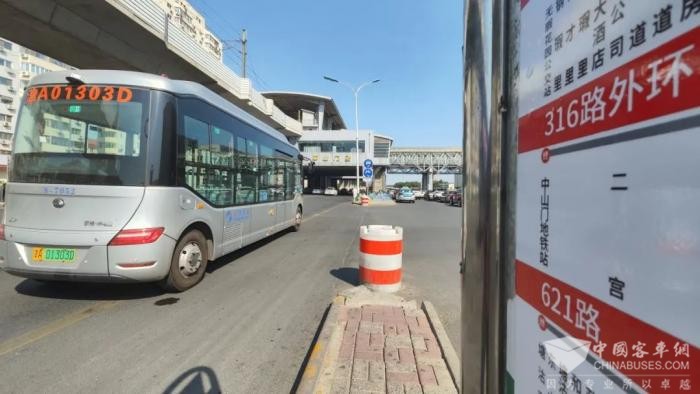 在中山门地铁站公交站,一辆通体银色的小型公交车平稳进站。这是316路使用的第二款车型,相较于之前的车型,这个车型的车门更宽阔,乘客上下车更方便;车厢里面更宽敞,不管乘客是站着还是坐着,都会更加舒适。