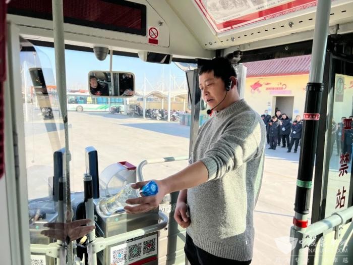 驾驶员驾驶车辆按规范停靠站牌,一名男性乘客手拿几瓶不明液体跟随其他乘客依次上车。驾驶员进行询问检查,经检查为散装白酒,告知其不能带其上车。
