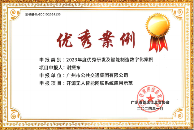 由集团申报且由集团大数据总监谢振东担任负责人的国家重点研发计划“开源无人智能网联系统应用示范”项目,荣获了“2023年度优秀研发及智能制造数字化优秀案例”。