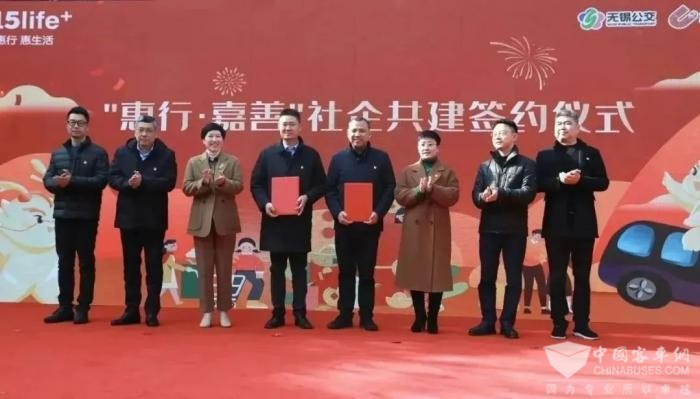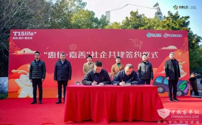 扬名街道梁中社区党委书记、居委会主任王锋与无锡公交集团中南分公司党总支书记、经理朱震鸣上台签署“惠行·嘉善”社企共建协议。