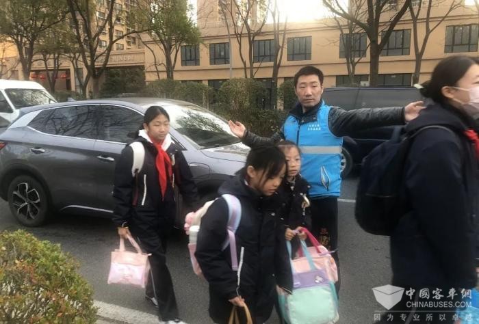 巴士三公司对途经学校线路增加运能,公交志愿者驻守在人行道两旁,挥动着“慢”字旗,在人行横道及路口边帮助疏导车辆、护送学生安全有序过马路。