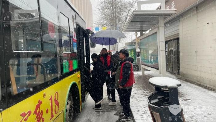 面对降雪,第一分公司从车辆保障、运行安全、站点值守及积雪清理等多个方面做好应对,路队管理人员在岗在位,安排志愿者上线护站、清理站台积雪、擦拭座椅,线路长勘察道路通行情况,组织好线路运力,满足乘客的乘车需求。