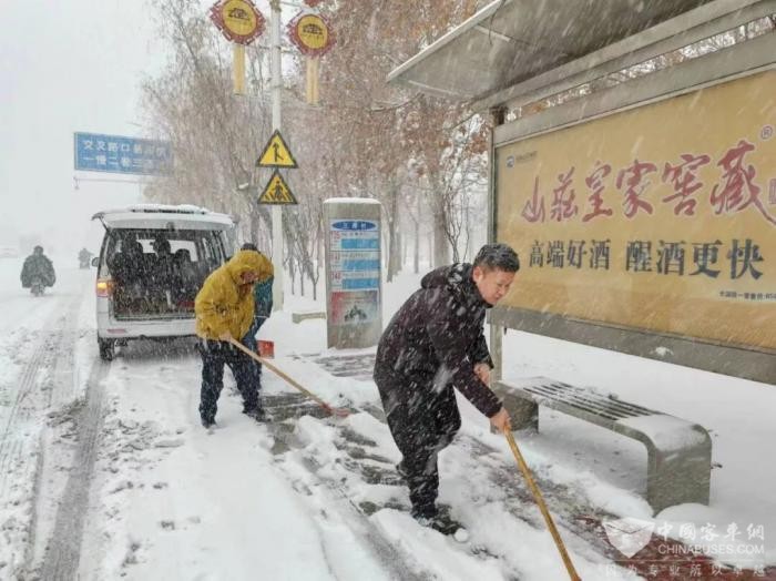 为保障市民的安全出行,公司根据天气预警,提前一天对车辆的灯光、刹车、空调等重点部位进行了全面检查,确保车辆状况良好;密切关注降雪及路面情况,通过车载智能设备及时发送雪天行车注意事项,管理人员利用车长发车前的间隙,面对面叮嘱车长控制车速,提高安全防范意识;车长也早早到达工作岗位,提前开启车内暖风,清理车厢地板积雪,为乘客提供温馨、优质的出行服务;公交志愿者们到各大站点开展志愿服务,引导市民乘车、清理站台积雪,提醒乘客注意安全。