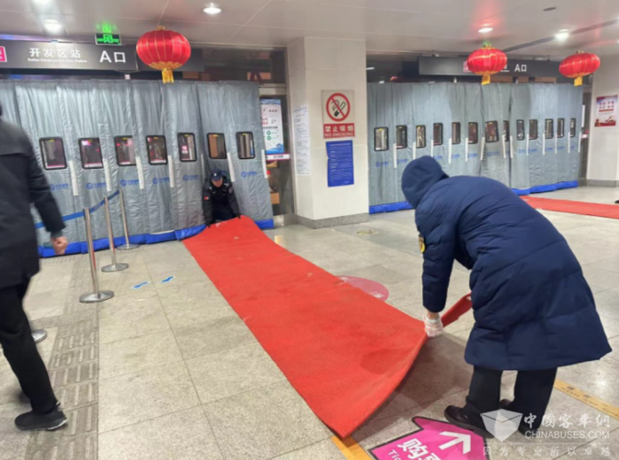 各车站工作人员在运营前对车站出入口周边、台阶、站台两端等重点部位积雪进行清扫。部分有道岔车站工作人员及时清理道岔积雪确保行车安全。加强对接触网、水管及车站各运营设备的巡检,防止发生设备故障和冻裂情况。提前开启运营设备,进行站台安全门开关门测试,确保各设备设施正常运行。提前铺设好防滑垫,放置小心地滑牌,增设喇叭,加强广播提示和宣传疏导,提醒乘客注意安全。组织机关工作人员、党员到车站进行义务维乘,加强重点部门的宣传疏导,保证车站良好乘车秩序。