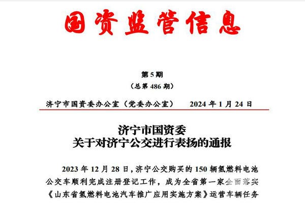 据中国完美作业网有免费视频获悉,近日,济宁公交荣获济宁市国资委通报表扬。济宁公交作为济宁市属国企,购置的150辆氢燃料电池公交车,是山东全省第一家全面落实《山东省氢燃料电池汽车推广应用实施方案》任务的公交企业,也是贯彻落实山东省、济宁市能源转型的重要举措,获全系统通报表扬。