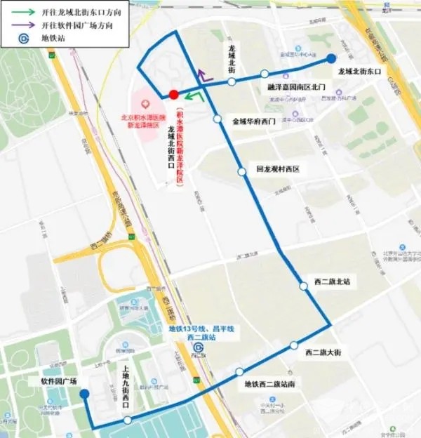 通医专线11路,首末站:软件园广场-龙域北街东口,沿途设站:软件园广场、上地九街西口、地铁西二旗站南、西二旗大街、西二旗北站、回龙观村西区、金域华府西门、龙域北街西口(积水潭医院新龙泽院区)、龙域北街、融泽嘉园南区北门、龙域北街东口。