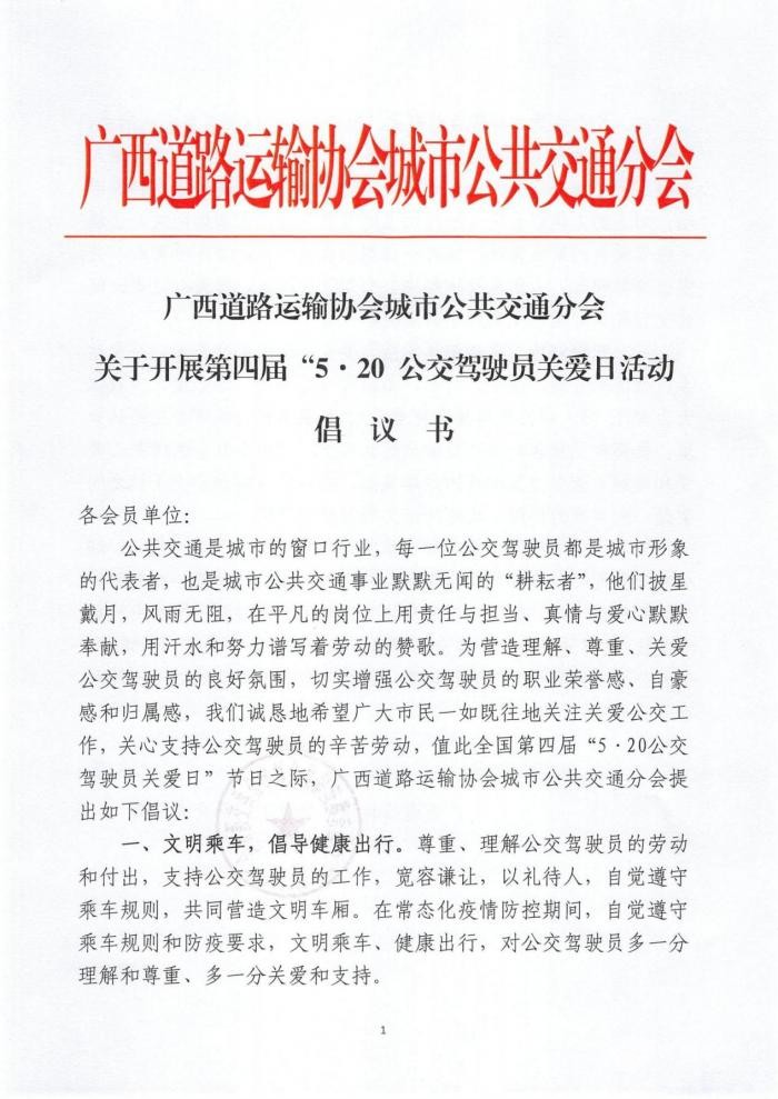 关注关爱公交工作 广西“5·20 ”公交驾驶员关爱日活动倡议书
