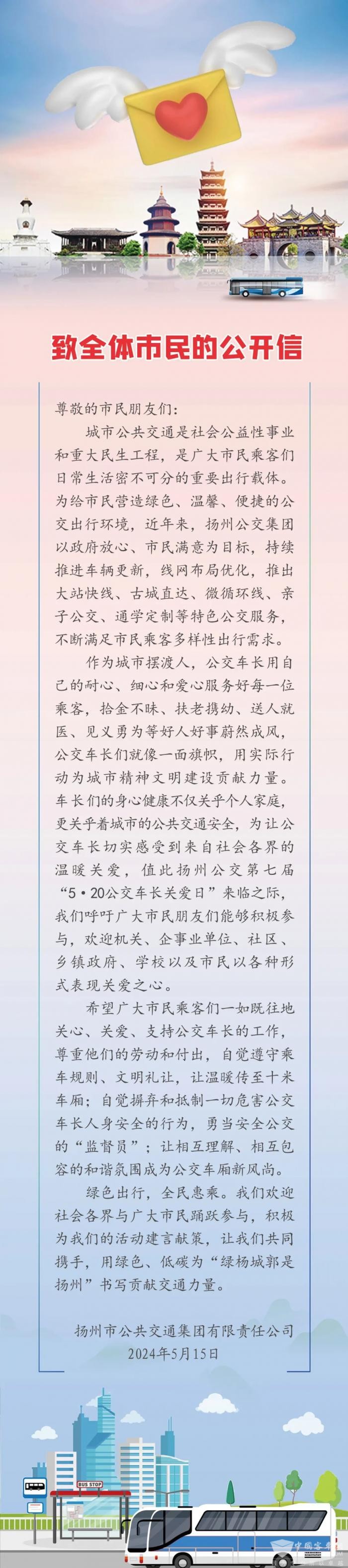 520公交驾驶员关爱日前夕 扬州公交给全体市民写了这样一封信
