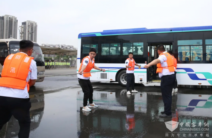 公交车因汛期恶劣天气导致车辆和乘客被困,车队及时启动应急预案,应急突击队到达现场并采取救援绳施救,将乘客有序撤离到安全地带。