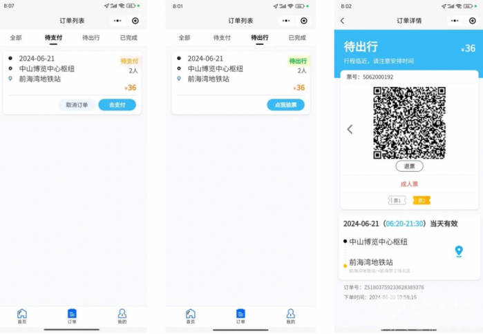 乘客可在微信搜索“深中跨市公交专线”小程序,进行线上购票、退票、改签、订单查询等操作。在乘车前,乘客可以在线查询班次和购票。在乘车时,乘客出示车票二维码即可检票上车。