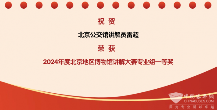 2024年7月24日,在2024年度北京地区博物馆讲解大赛决赛中,北京公交馆讲解员雷超表现出色,荣获专业组一等奖,并直接晋级“博协杯”全国博物馆讲解大赛半决赛。