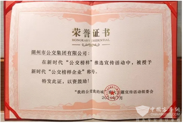 2024年7月30日,在交通运输部主办的2024年“我的公交我的城”重大主题宣传活动中,新时代“公交榜样”推选宣传活动结果发布,湖州交通集团所属湖州公交被授予新时代“公交榜样企业”称号。