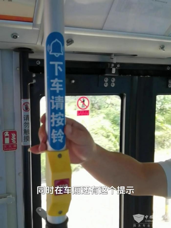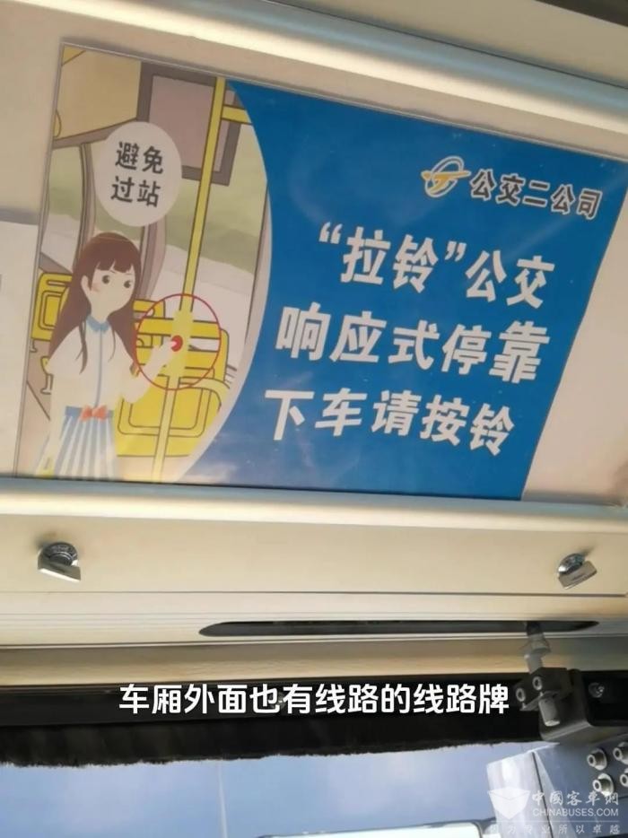 此外,为了确保信息的显眼性,公交车辆的多个关键位置,包括立柱、车门玻璃和车厢内广告栏等处,都张贴了醒目的标识,告知乘客如何通过按铃来指示下车需求。