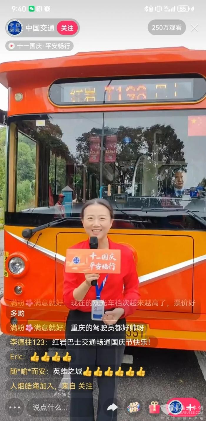 国庆节当天,“中国交通”快手政务号在线接力大联播全国具有代表性的11个点位,与全国网友一起共鉴交通运输中流动的中国力量,观光巴士成为重庆市唯一直播单位。短短10分钟的直播,吸引250万余人同时在线观看,获得了全国各地网友纷纷留言点赞~