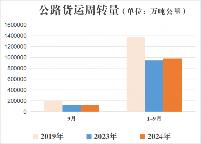 1-9月累计完成公路货运周转量978503.3万吨公里,比2023年同期增长3.42%,比2019年同期下降28.8%。