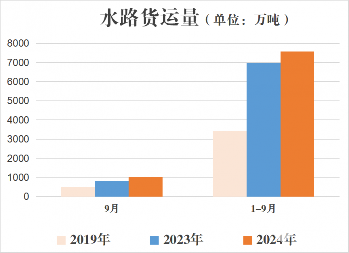 1-9月累计完成水路货运量7570万吨,比2023年同期增长8.7%,比2019年同期增长119.8%。